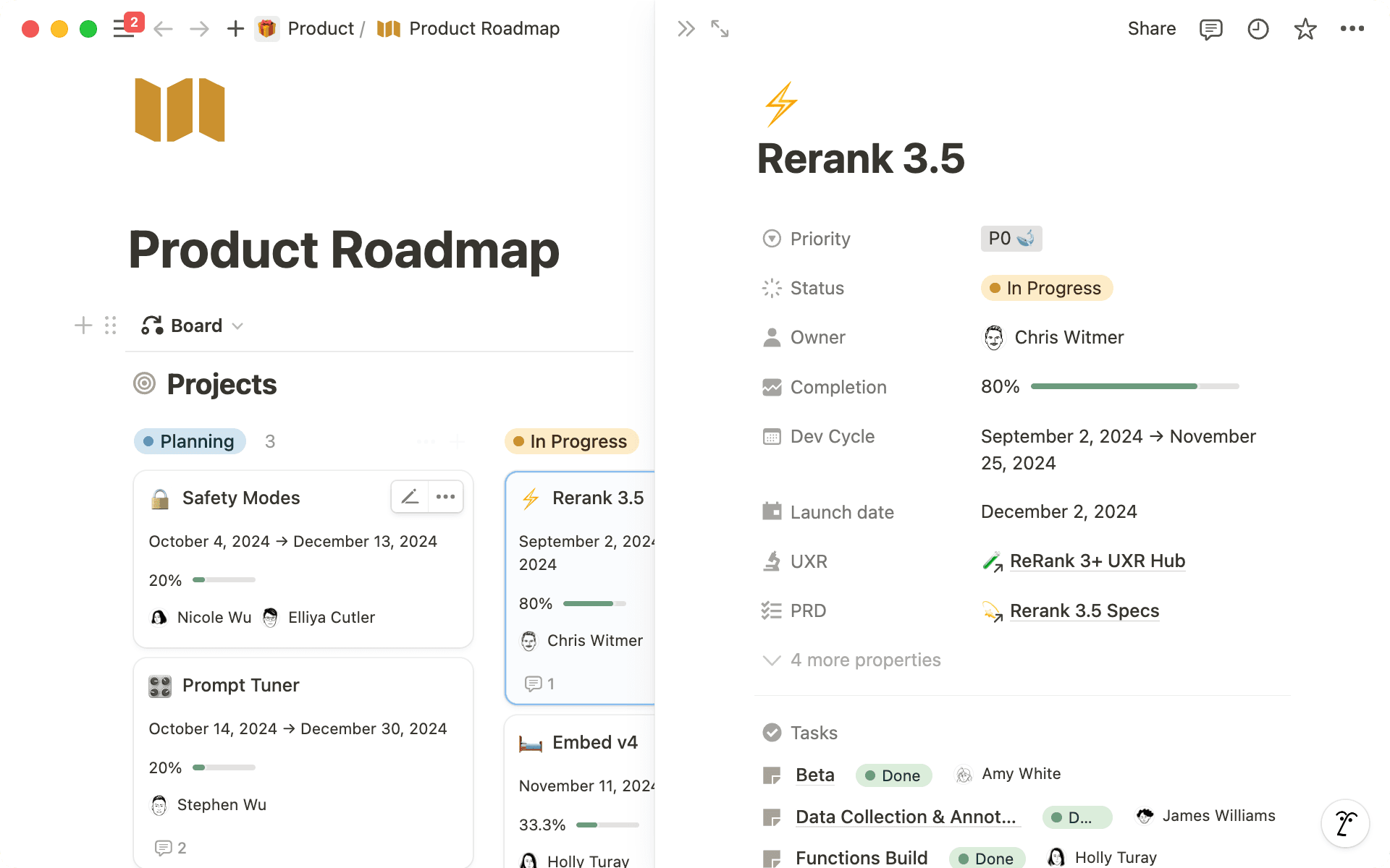 Cohere typically has between 30 and 40 people working on a single project, across multiple functions and time zones. Product managers orchestrate collaboration across these cross-functional teams, using Notion as their command center to seamlessly connect high-level strategy with day-to-day execution. By centralizing critical information and workflows in one place, PMs can effectively guide teams toward shared goals while maintaining clarity and momentum throughout the development process.